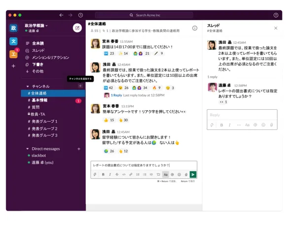 - Slackでの登録名の前に@をつけることで質問をしてきた学生にメンション(通知)することも可能です.
