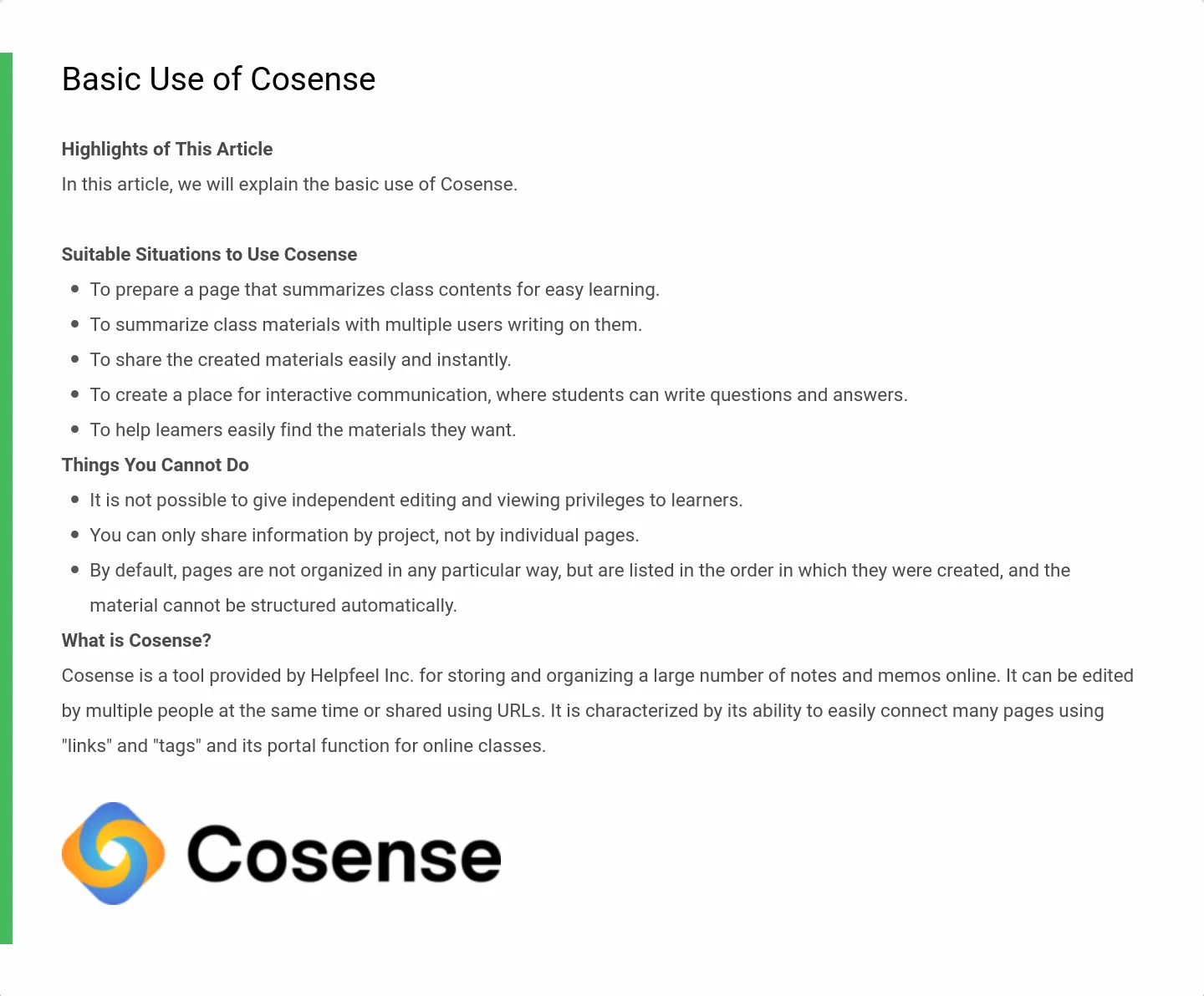 Cosense is a tool provided by Helpfeel Inc. for storing and organizing a large number of notes and memos online. It can be edited by multiple people at the same time or shared using URLs. It is characterized by its ability to easily connect many pages using “links” and “tags” and its portal function for online classes.