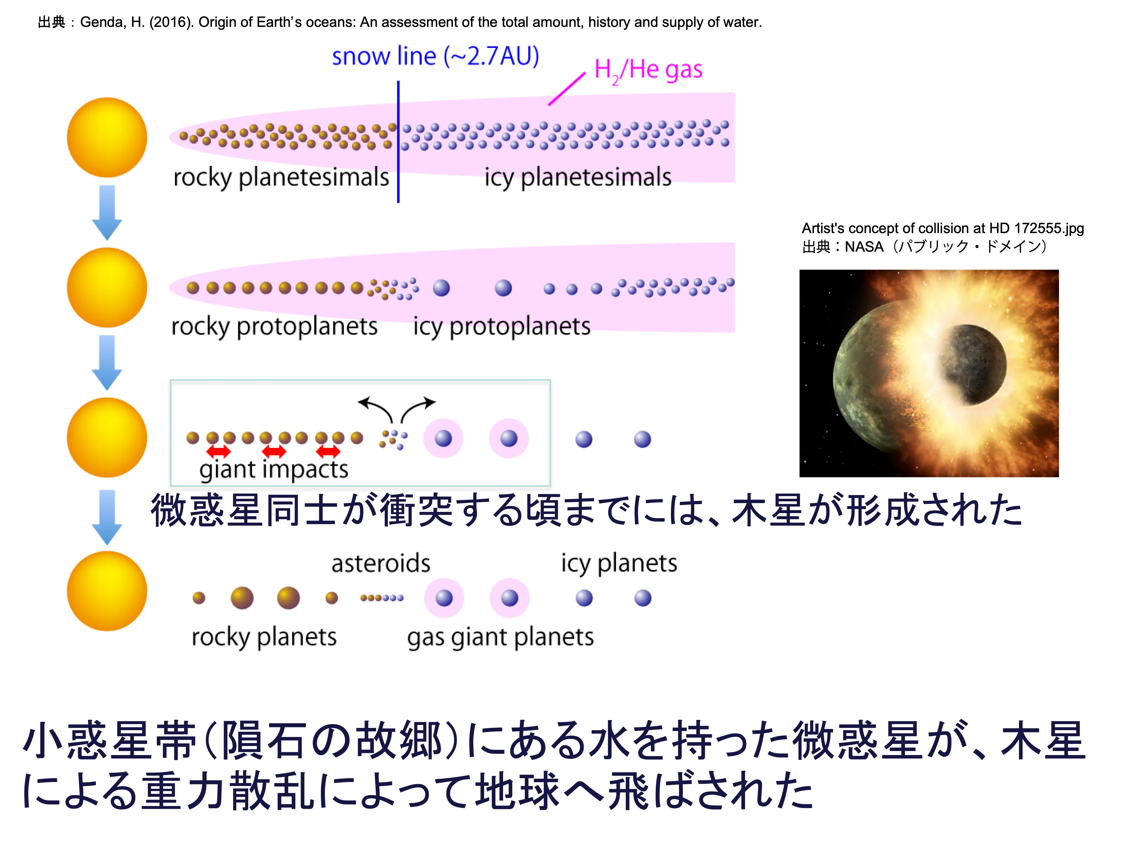 - 地球の誕生と進化:ジャイアントインパクト、マグマオーシャン、コア-マントルの分離から始まる固体地球の形成と進化について議論する